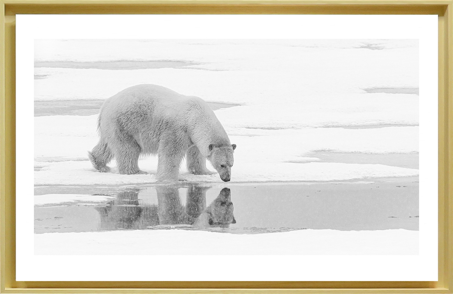 Approche d'un ours sur la banquise lors d'une averse de neige au Spitzberg, mai 2012.